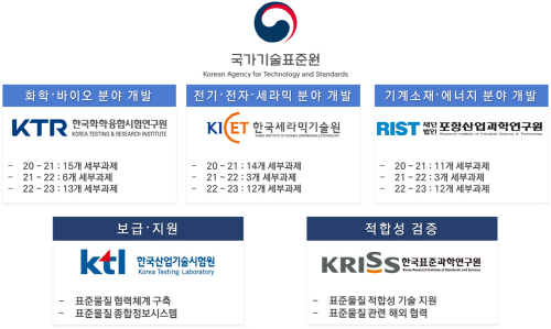 국내에서는 한국표준과학연구원(KRISS)을 비롯해 20여 개의 시험연구기관 및 산업체가 표준물질의 개발과 제조활동을 수행하고 있으며, 표준물질의 역할과 소부장 연구개발에서의 중요성이 대두되어 2020년부터 2023년까지 상용표준물질 개발/보급사업이 국가기술표준원의 주도로 그림 1과 같이 진행되었다. 화학/바이오 분야 표준물질개발은 한국화학융합시험원, 전기/전자/세라믹분야는 한국세라믹기술원, 기계소재/에너지 분야는 포항산업과학기술원이 총괄을 맡아 총 89개 세부과제가 수행되었다. 또한, 표준물질종합정보시스템 구축 등의 개발된 표준물질의 보급 및 지원 활동을 한국산업기술시험원에서 수행하였으며, 국내 NIM(National Institute of Metrology)기관인 한국표준과학연구원이 개발 표준물질의 적합성 검증 기술 지원 및 관련 해외기관 협력 역할을 수행하였다. 2022년 12월 기준으로 한국표준과학연구원을 포함한 9개의 공공기관에서 670개의 표준물질을 생산해 보급하고 있으며, 15개의 민간업체에서도 587개의 표준물질을 생산하고 있다. 그러나 아직까지 국내에서 필요한 정도인 3,000종에는 절대적으로 미치지 못하고 있는 상태다.
