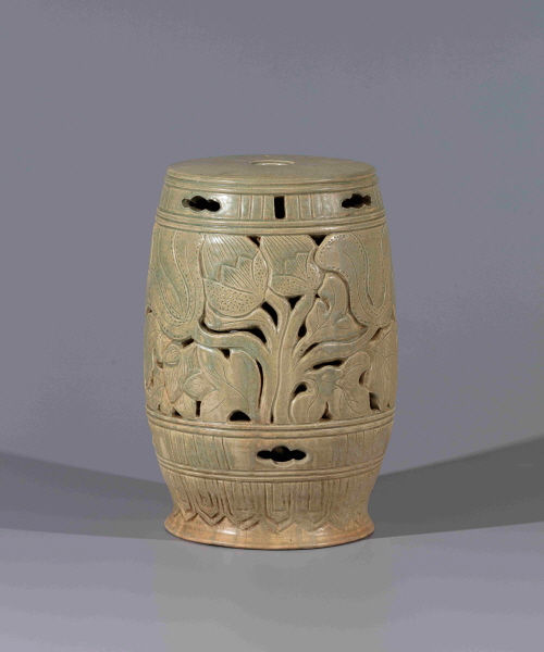 사진1) 「백태청자 투각 모란무늬 의자」 조선시대 전기, 높이: 35cm 윗지름: 20cm 바닥지름: 20.5cm