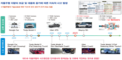 그림 2. 자율주행 기술고도화에도 불구하고 인지센서 한계성능으로 인한 안전사고 증가. 출처:한국자동차연구원