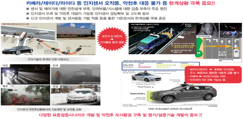 * 자율주행서비스기술이 우버 및 구글과 같이 전통적인 완성차업체가 아닌 IT기업 중심으로 개발되면서 센서 및 제어기에 대한 안전설계부족, 단위부품 및 시스템에 대한 검증 부족 등으로 인한 다수의 인명사고 발생으로 인해 자율주행 기술에 대한 불안감 증폭 및 신뢰도가 저하 되는 등 다양한 문제 발생