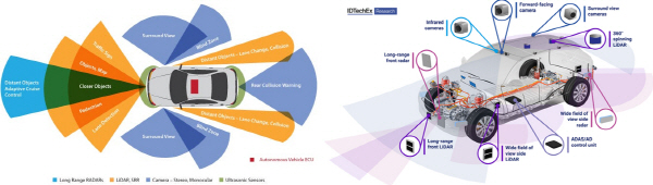 그림 1. 자율주행 인지센서 유형 및 적용기술. 출처: IDTechEx