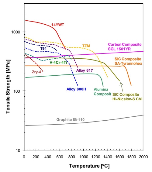 그림 1은 극한 환경에서 적용될 금속과 SiC 복합체의 온도에 따른 강도 변화를 나타낸다. 고온 금속은 1000°C 이전까지는 우수한 강도 값을 유지하나 열화 온도의 차이는 있으나 온도가 올라감에 따라 강도의 급격한 감소가 발생한다. 반면 1000°C 까지의 강도 값은 상대적으로 낮더라도, 고온으로 올라가도 SiC 복합체를 비롯한 CMC (Ceramic Matrix Composite)의 강도는 열화없이 계속하여 유지됨을 볼 수 있다. 금속 중에서 경수로 핵연료 피복관 소재인 Zircalloy-4 (Zry-4)는 경수로 운전 온도인 350°C 미만에서 온도에 따른 강도의 감소가 발생하며, 고온형 원자로의 구조재나 항공우주용 고온 부품으로 사용되는 고온용 금속인 초합금 - Alloy 617, TZ-Mo 합금도 800~1200°C 범위에서 강도의 감소가 나타난다. SiC 복합체는 1350~1700°C 범위에서 강도의 감소가 나타나며, 복합체를 제조하는 공정이나 강화제로 사용되는 SiC 섬유의 특성에 따라 강도 감소가 발생하는 온도에 차이가 있다. 3세대 SiC 섬유인 일본 Ube사의 Tyranno-SA 나 NGS Advanced Fibers사의 Hi-Nicalon type S는 결정성이 높고 불순물 함유량이 적기 때문에 상대적으로 우수한 고온 강도 특성을 나타냄을 알 수 있다[4].