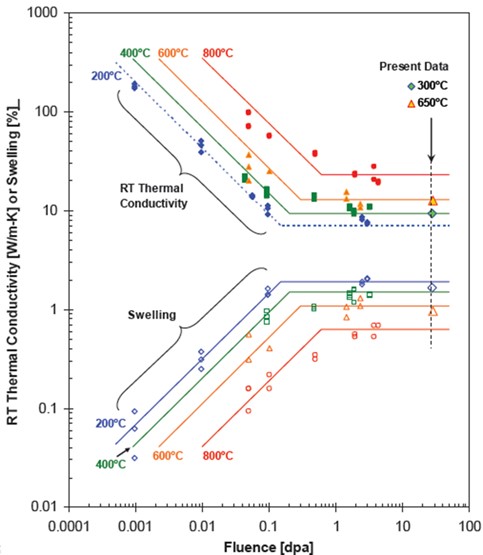 그림 2는 중성자 조사 양에 따른 팽윤(swelling)과 열전도도(a)와 강도 변화(b)를 나타낸 곡선이다. 큰 에너지의 중성자로 조사되면 재료는 원자 단위의 원자 이동이 발생하여 공공과 격자간 자리 이동으로 부풀음 현상과 열전도도의 열화가 발생한다. 그러나 그림 2(a)에서 볼 수 있듯이 SiC 복합체는 1 dpa까지는 팽윤 현상이나 열전도도의 빠른 열화가 발생하나 그 이상의 조사양에서는 물성 열화가 포화된 값을 나타내며 더 이상의 열화가 발생하지 않음을 알 수 있다.