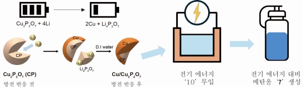 일반적으로는 이런 정교한 복합 구조를 만들기 어렵지만, 연구팀은 리튬배터리의 방전 원리를 활용해 이를 손쉽게 만들었다. 배터리 방전처럼 전극 재료에 전류를 흘려주면, 전극에 포함된 구리 피로인산염 일부가 순수 구리로 환원되며 두 물질이 한 입자 안에서 자연스럽게 섞이는 복합 구조가 형성된다. 촉매를 제외한 전극 물질 등은 물로 씻어내 손쉽게 제거할 수 있다.