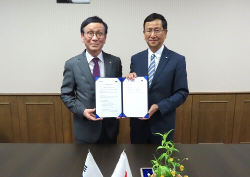 최철진 KIMS 원장(왼쪽)과 Kazuhiro Hono NIMS 원장이 업무협약을 체결하고 기념촬영하고 있다. (자료제공: KIMS)