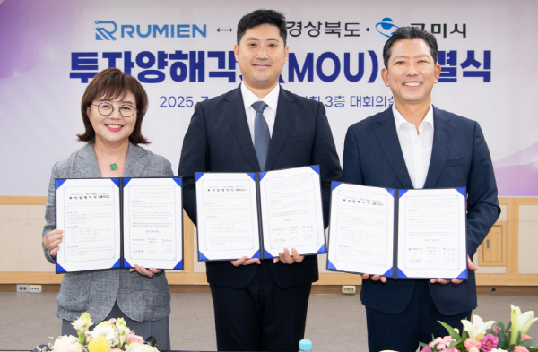 루미엔㈜와 경상북도·구미시 간 투자양해각서(MOU)를 체결했다. 왼쪽부터 양금희 경북도 경제부지사, 서태민 루미엔㈜ 총괄부사장, 김장호 구미시장. (자료제공: 경북도)