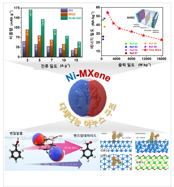 한국연구재단(이사장 홍원화)은 전북대 유승화, 진경환 교수와 성균관대 박성준 교수 공동연구팀이 니켈(Ni)-맥신(MXene) 야누스(Janus) 양자점을 합성하고, 이를 적용한 차세대 슈퍼커패시터와 유기물 변환 촉매(탄소, 수소, 산소 등으로 구성된 유기물의 분자 구조를 변환시키는 물질)기술을 개발했다고 8월 13밝혔다.