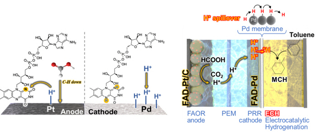 UNIST(총장 박종래)는 에너지화학공학과 송현곤 교수팀이 생체 조효소 FAD를 전극 표면에 입혀 저전압으로 수소를 생산하고 이를 바로 액상 유기물에 저장할 수 있는 전기화학 시스템을 개발했다고 8월 26일 밝혔다.