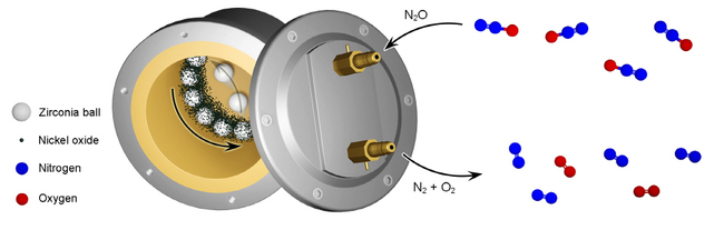 연구팀은 지름 수 밀리미터의 구슬을 넣은 반응 용기(볼밀)에 니켈산화물(NiO) 촉매와 아산화질소 가스를 함께 넣고 흔드는 방식을 사용해 아산화질소를 분해해 냈다. 구슬의 충돌과 마찰로 니켈산화물 촉매 표면에 고밀도 결함과 초산화(ultra-oxidized) 상태가 형성되는데, 이 덕분에 기존 열촉매로는 불가능했던 저온·고속 분해가 가능하다.