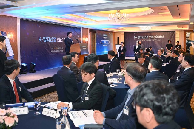 산업통상부(장관 김정관, 이하 산업부)는 11월 5일 서울 롯데호텔에서 ‘K-양자산업 연합 출범식’을 개최했다고 11월 5일 밝혔다. 이번 출범식에는 문신학 차관, 더불어민주당 이언주 최고위원을 비롯해 양자기술 공급·수요기업, 대학, 연구기관, 금융기관, 지원기관 등 약 150명이 참석했다.