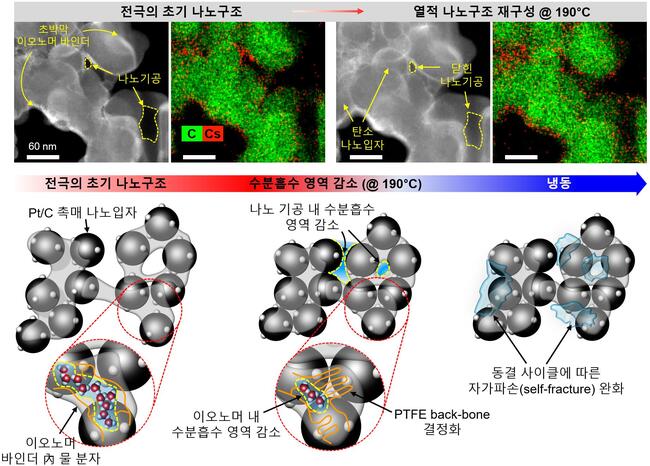 한국연구재단(이사장 홍원화)은 국립공주대학교 표재범 교수, 한국과학기술원 김택수 교수, 국방과학연구소 김지훈 박사 공동 연구팀이 전극 동파의 원인이 ‘나노 기공’이 아닌 ‘이오노머(ionomer) 결합체’ 내부 결빙임을 규명하고, 190℃에서 10분간의 열처리 공정을 통해 이를 해결했다고 11월 6일 밝혔다.