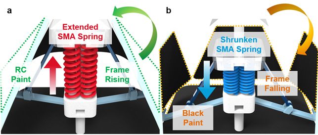 구체적으로, 소자의 3차원 구조가 닫히면 표면이 태양열을 반사하고 중적외선을 방출해 냉방 모드로 작동한다. 반대로 구조가 열리면 태양빛을 흡수하는 흑색 표면이 노출되어 난방 모드로 전환된다. 즉, 계절이나 외부 온도 변화에 따라 별도의 조작 없이도 스스로 냉방과 난방 기능을 오가며 건축물의 에너지 소비를 줄일 수 있다.
