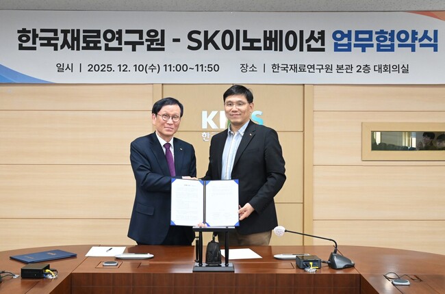 한국재료연구원(KIMS, 원장 최철진)은 12월 10일 창원 본원에서 SK이노베이션 환경과학기술원(원장 김필석)과 AI 및 전기화(Electrification) 시대를 선도할 미래 핵심 소재 개발을 위한 엄무협약(MOU)을 체결했다고 11일 밝혔다.