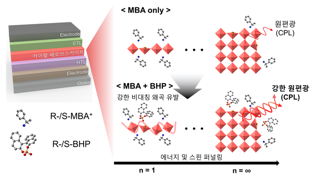 기존에는 키랄 분자 한 종만 첨가하는 방식이 주를 이뤘으나, 구조의 비틀림이 균일하지 않아 편광 방향의 순도나 밝기가 급격히 떨어졌는데, 연구팀은 역할을 분담하는 두 가지 키랄 분자를 혼합하는 방식으로 이를 해결했다. ‘메틸벤질 암모늄(MBAI)’과 ‘비나프틸 인산염(BHP)’이다.