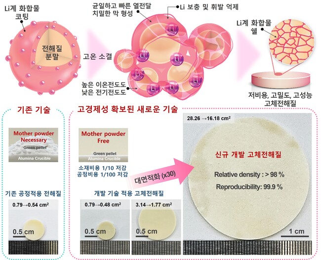특히 연구진은 실험실 수준의 소형 펠릿을 넘어 기존보다 10배 이상 큰 16 cm2 규모의 대면적 고체전해질 막을 수율 99.9%로 제조하는 데에도 성공했다.
