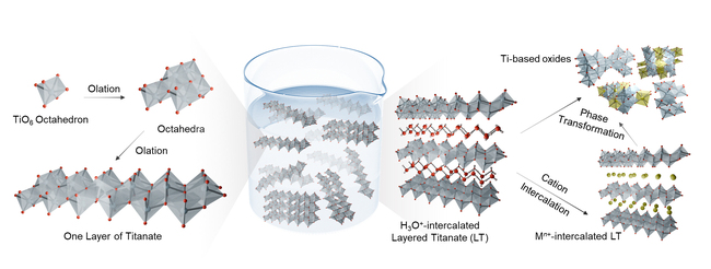 연구팀은 수산화암모늄 용액을 이용한 새로운 합성법을 개발했다. 수산화암모늄 용액 속에 녹아 있는 티타늄 산화물의 원료 성분들이 화학반응을 통해 층상 구조로 조립되는 상향식 합성법이다. 층 안에는 수소 이온이 들어간 형태로 조립된다. 이렇게 합성된 층상 티타네이트를 삽입하고자 하는 금속 양이온이 녹아 있는 용액에 담그면, 층 사이에 미리 삽입되어 있던 수소 이온이 금속 양이온으로 쉽게 대체된다.