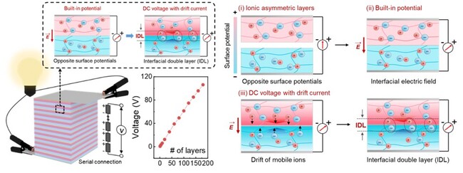 연구팀은 “생체 세포막을 이온이 선택적으로 이동할 때 전압이 발생하는 ‘막전위’ 현상에 착안해 단위 전기셀을 개발하고, 이를 전기가오리처럼 적층해 고전압 전기를 만들어낼 수 있었다”고 설명했다.