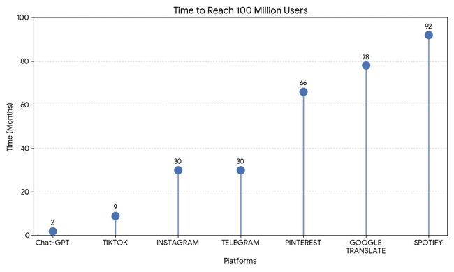 그림 1. 출시 후 월간 사용자수 1억명 달성 시간 (Paul, K. ChatGPT sets record for fastest-growing user base - analyst note. Reuters, Feb 1, 2023.)