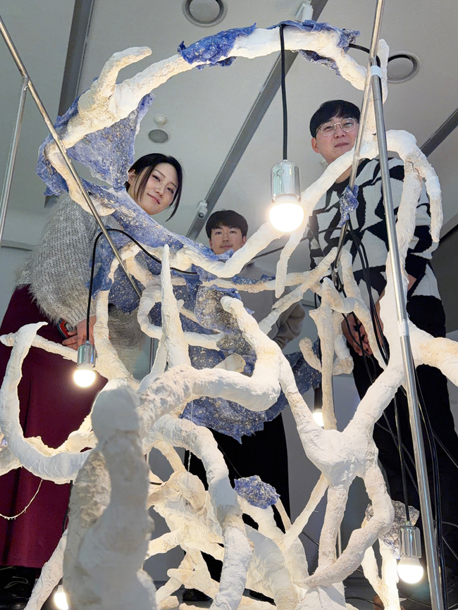 특히, 작품에는 고현석 박사(한국세라믹기술원)가 개발한 ‘건축 보강용 고속 경화형 고강도 무기 페이스트’* 소재 합성 기술이 굴패각과 더해져 활용되었으며, 여기에 두 작가의 바이오 텍스타일*이 가미되어 자문과 협력을 통해 예술 조형물로 재탄생했다.