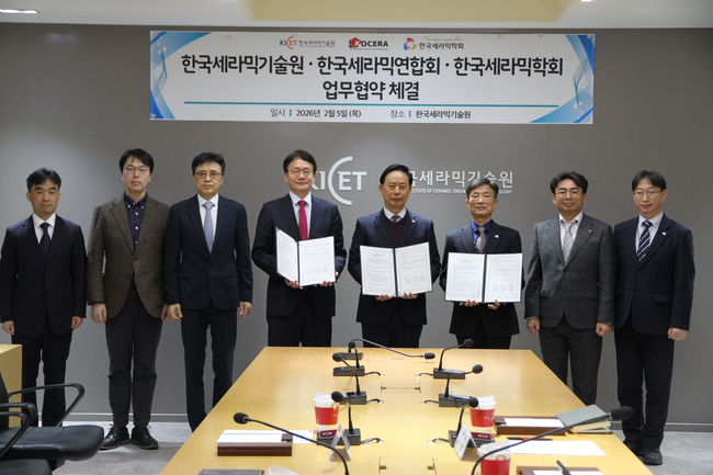 한국세라믹연합회(회장 이종근), 한국세라믹학회(회장 이기성), 한국세라믹기술원(원장 윤종석)은 2월 5일 한국세라믹기술원 본원 대회의실에서 국내 세라믹 산업의 기술 발전과 지속 가능한 선순환 생태계 구축을 위해 산학연 대표로서 다자간 업무협약(MOU)을 체결했다고 10일 밝혔다.