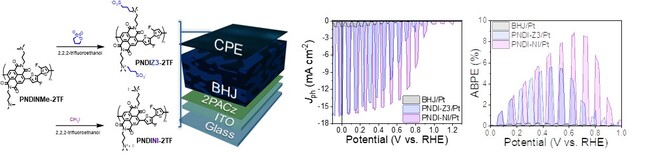 공동 연구팀은 광활성층에 자체 개발한 다기능성 특수 고분자(PNDI-NI)를 코팅해 효율과 내구성이 뛰어난 유기 광전극을 만들었다. 이 특수 고분자는 유기 광전극에 쓰는 일반적인 소수성 고분자와는 달리 소수성과 친수성을 모두 갖춘 특징이 있어 백금 촉매가 표면에 고르게 형성될 수 있다.