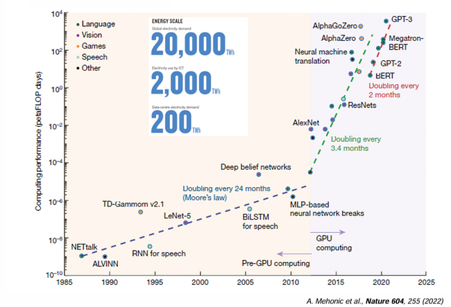 딥러닝 모델의 규모와 복잡도가 증가함에 따라, 대표적인 비전·언어·게임 AI 모델들의 연산량은 지난 수십 년 동안 기하급수적으로 증가해 왔다. 특히 GPU 기반 학습·추론에 요구되는 연산량이 몇 개월 단위로 두 배씩 증가하는 추세는, 글로벌 ICT 및 데이터센터 전력 수요를 크게 끌어올리며 탄소 중립 관점에서도 심각한 도전 과제로 대두되고 있다. [3] 언어 모델, 비전 모델, 강화학습 에이전트 등 다양한 AI 워크로드의 연산 요구량과 이에 따른 전력 소비는, 향후 기존 디지털 컴퓨팅만으로는 지속가능한 확장이 어렵다는 점을 보여준다. 고에너지 효율 뉴로모픽 하드웨어는 이러한 연산량·에너지 간극을 완화할 수 있는 유력한 대안으로 제시되고 있다.