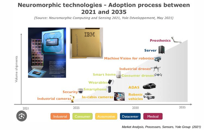 따라서, 인간의 뇌를 모방하여 기존의 컴퓨팅 시스템을 뛰어넘는 뉴로모픽 컴퓨팅 아키텍쳐 (Neuromorphic computing architecture)가 이에 대한 대안 기술로 떠오르고 있다. 병렬처리의 핵심 기능인 뉴로모픽 컴퓨팅 시스템은 시간과 에너지 효율적인 방식으로 대규모 비정형 데이터를 처리할 수 있다. 뉴로모픽 기술은 산업, 소비자, 자동차, 의료, 데이터센터 등 다양한 분야에서 순차적으로 적용이 확대될 것으로 전망된다[1]. 예를 들어, 산업용 카메라 및 머신 비전, 드론, 스마트홈·보안 시스템, 웨어러블 기기, ADAS 및 자율주행차, 의료 모니터링 등에서 뉴로모픽 프로세서와 센서의 탑재가 점진적으로 증가할 것으로 예측된다.