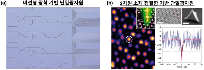 그림 2. (a) 비선형 광학 기반 단일광자원 광집적회로. (b) 2차원 소재 점결함 기반 단일광자원 기술[5].