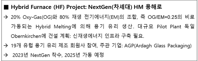 비록 2022년 EU 혁신자금 조달에 실패하였지만, 2023년 독일 정부의 자금을 받아서 AGP사 주도아래 앞서 언급한 Nikolaus-SORG사의 기술을 도입하여 독일 Obernkirchen지역에 “NextGen” 이름의 차세대 HM 용해로 Project를 착수하였고 2025년 말에 상업용 Amber 용기유리 생산을 목표로 하였다.