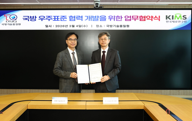 한국재료연구원(KIMS, 원장 최철진)은 3월 4일 국방기술품질원(기품원, 원장 신상범) 진주 본원 대회의실에서 기품원과 ‘국방 우주표준 협력 개발을 위한 양해각서(MOU)’를 체결했다고 3월 5일 밝혔다.