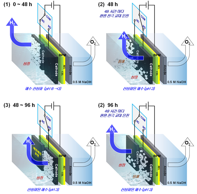 침전물이 다 녹으면 양 전극은 서로 역할을 바꿔 수소 생산과 침전물 제거를 동시에 진행할 수 있다. 연구진은 실험을 통해 48시간 주기로 각 전극의 역할을 바꿔주기만 하면 침전물 생성과 완전한 제거가 반복될 수 있음을 확인했다.