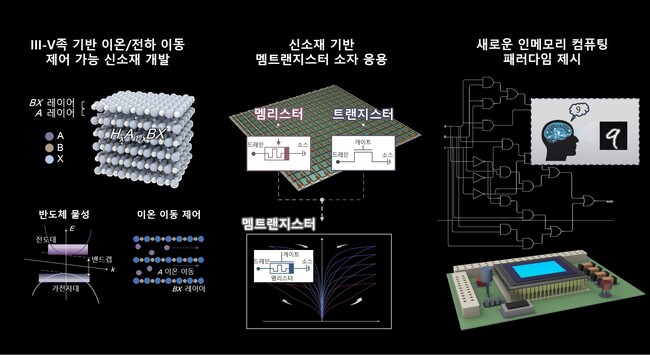 연구팀이 개발한 새로운 III-V 반도체 구조에서는 층 사이의 van der Waals 공간을 따라 이온이 이동할 수 있으며, 이 과정에서 전기적 저항 상태가 변화하는 멤리스터(memristor) 특성이 나타난다. 이러한 특성을 반도체 소자와 결합하여 멤트랜지스터(memtransistor) 구조를 구현함으로써, 하나의 소자에서 기억 기능과 연산 기능을 동시에 수행할 수 있음을 실험적으로 입증했다. 이 소자는 인간의 뇌 신경망처럼 신호의 세기와 시간에 따라 연결 강도가 변화하는 시냅스 동작을 모사할 수 있어 뉴로모픽 인공지능 소자로 활용될 가능성을 보여주었다. 또한 하나의 소자 내에서 데이터 저장과 연산을 동시에 수행할 수 있는 컴퓨트-인-메모리(Compute-in-Memory) 방식의 새로운 반도체 소자 개념을 제시했다. 이러한 기술은 인공지능 연산에 필요한 에너지 소모를 크게 줄이고, 차세대 저전력 인공지능 반도체 개발에 중요한 기반이 될 것으로 기대된다.