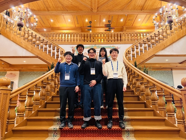 연구진 사진. (앞줄 왼쪽부터) 박경덕 교수(POSTECH 물리학과·반도체공학과, IBS/공동 교신저자), 문태영 석박통합과정(POSTECH 물리학과, IBS/제1저자), 서영덕 부연구단장(IBS 다차원 탄소재료 연구단·UNIST 화학과/공동 교신저자), (뒷줄 왼쪽부터) 이형우 연구원(POSTECH 물리학과/공저자), 구연정 연구원(POSTECH 물리학과/공저자). (자료제공: UNIST)